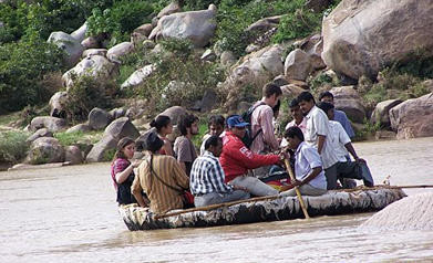 I positioned my bike. Both of us were feeling little uneasy. But I had to go the other side and there were no other means. A bridge standing nearby half built. With great difficulty and maneuver, I placed the bike on the coracle. With others we started floating on water with amazement and fear. I saw toughness of life. Two men were rowing the coracle with great difficulty to take it to the destination through rough water. Charge to take commuter to the other side of the river was Rs. 10/- only. How much could they earn at the end of the day of such struggle? Within 15 minutes we reached the other side of river, it was quite steep slope. Leaving these struggling people behind, we moved ahead. By the time we were feeling very hungry. But no where we could locate any restaurant. When I asked a bicyclist he guided us to a restaurant where the worked. This side of the river was quite serene and isolated compared to Hampi. Lush green paddy field covered the earth wherever we could stretch our eyes. The restaurant was surrounded by trees and plant. It was almost past 4pm. We were doubtful about getting anything at this hour. We were terribly hungry and exhausted. Luckily we got something to eat and we felt little relax. Food was not that good, but in that extreme condition, anything feels like boon from God. One does not look for delicacy that time. So many people everyday are suffering from the pain of hunger.